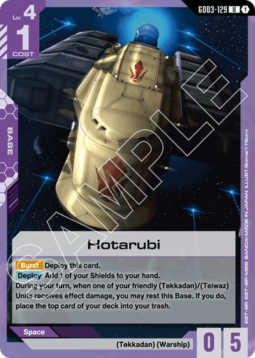 During your turn, when one of your friendly (Tekkadan)/(Teiwaz) Units receives effect damage, you may rest this Base. If you do, place the top card of your deck into your trash.