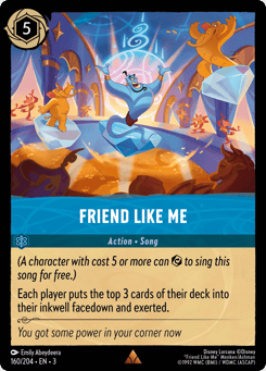 (A character with cost 5 or more can {Exert} to sing this song for free.) Each player puts the top 3 cards of their deck into their inkwell facedown and exerted.