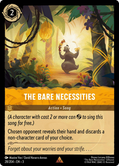(A character with cost 2 or more can {Exert} to sing this song for free.) Chosen opponent reveals their hand and discards a non-character card of your choice.