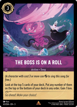 (A character with cost 3 or more can {Exert} to sing this song for free.) Look at the top 5 cards of your deck. Put any number of them on the top or the bottom of your deck in any order. Gain 1 lore.