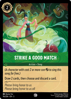 (A character with cost 2 or more can {Exert} to sing this song for free.) Draw 2 cards, then choose and discard a card.