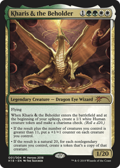 Flying When Kharis & The Beholder enters and at the beginning of your upkeep, create a 1/1 white Human creature token and make a charisma check. (Roll a d20.) • If the result plus the number of creatures you control is greater than 11, put a +1/+1 counter on each creature you control. • If the result is a natural 20, for each nonlegendary creature you control, create a token that's a copy of that creature.