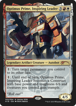 {1}: Turn target permanent you control to its other face. {1}: Until end of turn, Optimus Prime, Inspiring Leader becomes a Construct with base power and toughness 6/6 and creatures you control gain trample.