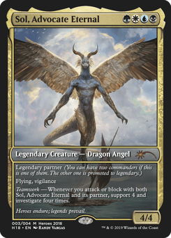 Legendary partner (You can have two commanders if this is one of them. The other one is promoted to legendary.) Flying, vigilance Teamwork — Whenever you attack or block with both Sol, Advocate Eternal and its partner, support 4 and investigate four times.