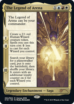 The Legend of Arena can be your commander. I, II — Create a 2/1 red Human Wizard creature token. Spells you cast this turn cost {1} less to cast for each Wizard you control. III — Search your library for a planeswalker card, put it onto the battlefield, then shuffle your library. It enters with an additional loyalty counter on it for each Wizard you control.