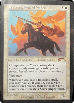 Companion — Your starting deck contains only nostalgic cards. (Retro frames, legends, and artifacts are nostalgic.) Vigilance Whenever you cast a nostalgic spell, you may pay {2}. If you do, put a +1/+1 counter on Treizeci, then for each +1/+1 counter on it, create a Serra Angel token.
