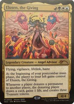 Flying, vigilance, lifelink, haste At the beginning of your second main phase, the player to your left gains control of Elusen, the Giving. Whenever a player donates a permanent to another player, the donating player draws a card, gains 1 life, and creates three Treasure tokens.