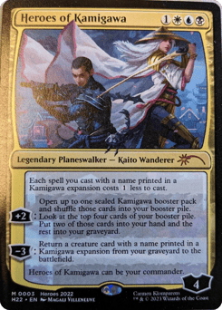 Each spell you cast with a name printed in a Kamigawa expansion costs {1} less to cast. [+2]: Open up to one sealed Kamigawa booster pack and shuffle those cards into your booster pile. Look at the top four cards of your booster pile. Put two of those cards into your hand and the rest into your graveyard. [−3]: Return a creature card with a name printed in a Kamigawa expansion from your graveyard to the battlefield. Heroes of Kamigawa can be your commander.