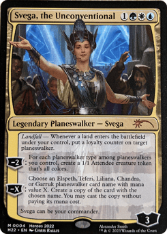 Landfall — Whenever a land enters under your control, put a loyalty counter on target planeswalker. [−2]: For each planeswalker type among planeswalkers you control, create a 1/1 Attendee creature token that's all colors. [−X]: Choose an Elspeth, Teferi, Liliana, Chandra, or Garruk planeswalker card name with mana value X. Create a copy of the card with the chosen name. You may cast the copy without paying its mana cost. Svega can be your commander.