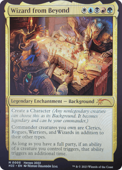 Create a Character (Any nonlegendary creature can choose this as its Background. It becomes legendary and can be your commander.) Commander creatures you own are Clerics, Rogues, Warriors, and Wizards in addition to their other types. As long as you have a full party, if an ability of a creature you control triggers, that ability triggers an additional time.