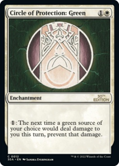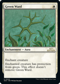 Enchant creature Enchanted creature has protection from green. This effect doesn't remove this Aura.
