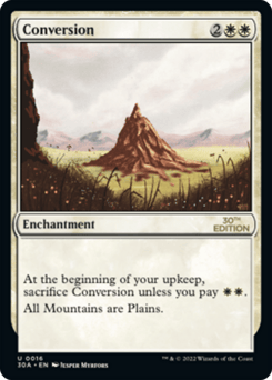 At the beginning of your upkeep, sacrifice this enchantment unless you pay {W}{W}. All Mountains are Plains.