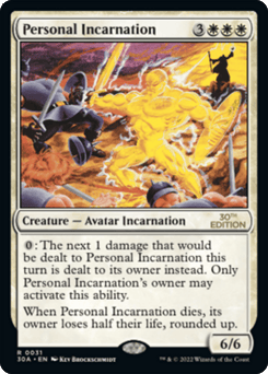 {0}: The next 1 damage that would be dealt to this creature this turn is dealt to its owner instead. Only this creature's owner may activate this ability. When this creature dies, its owner loses half their life, rounded up.
