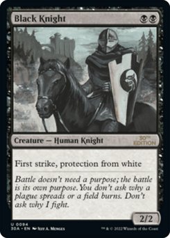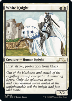 First strike (This creature deals combat damage before creatures without first strike.) Protection from black (This creature can't be blocked, targeted, dealt damage, or enchanted by anything black.)