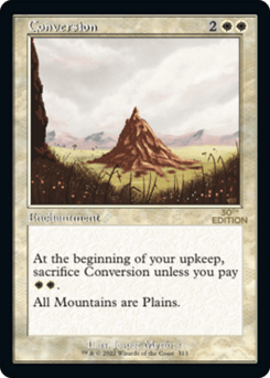 At the beginning of your upkeep, sacrifice this enchantment unless you pay {W}{W}. All Mountains are Plains.