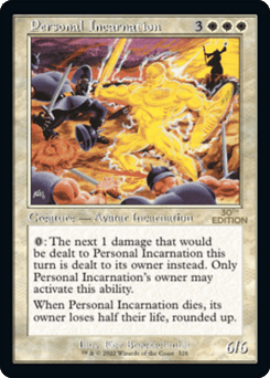 {0}: The next 1 damage that would be dealt to this creature this turn is dealt to its owner instead. Only this creature's owner may activate this ability. When this creature dies, its owner loses half their life, rounded up.