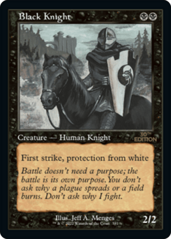 First strike (This creature deals combat damage before creatures without first strike.) Protection from black (This creature can't be blocked, targeted, dealt damage, or enchanted by anything black.)