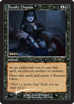 As an additional cost to cast this spell, sacrifice an artifact or creature. Draw two cards and create a Treasure token. (It's an artifact with "{T}, Sacrifice this token: Add one mana of any color.")