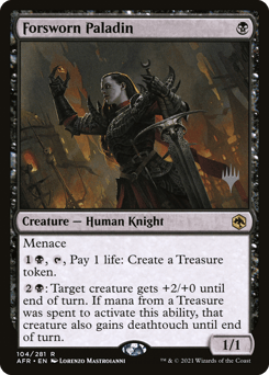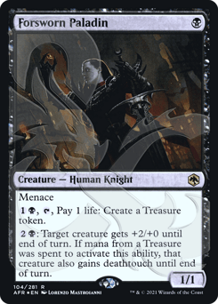Menace {1}{B}, {T}, Pay 1 life: Create a Treasure token. {2}{B}: Target creature gets +2/+0 until end of turn. If mana from a Treasure was spent to activate this ability, that creature also gains deathtouch until end of turn.