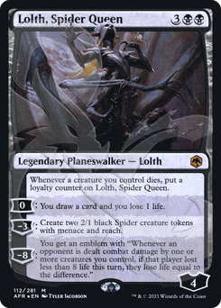 Whenever a creature you control dies, put a loyalty counter on Lolth. [0]: You draw a card and you lose 1 life. [−3]: Create two 2/1 black Spider creature tokens with menace and reach. [−8]: You get an emblem with "Whenever an opponent is dealt combat damage by one or more creatures you control, if that player lost less than 8 life this turn, they lose life equal to the difference."