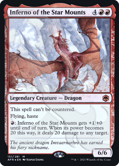 This spell can't be countered. Flying, haste {R}: Inferno of the Star Mounts gets +1/+0 until end of turn. When its power becomes 20 this way, it deals 20 damage to any target.