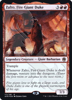Trample Whenever Zalto is dealt damage, venture into the dungeon. (Enter the first room or advance to the next room.)