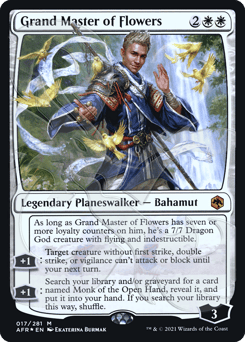 As long as Grand Master of Flowers has seven or more loyalty counters on him, he's a 7/7 Dragon God creature with flying and indestructible. [+1]: Target creature without first strike, double strike, or vigilance can't attack or block until your next turn. [+1]: Search your library and/or graveyard for a card named Monk of the Open Hand, reveal it, and put it into your hand. If you search your library this way, shuffle.