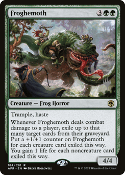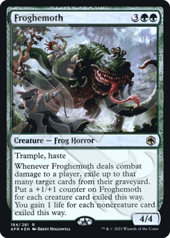 Trample, haste Whenever this creature deals combat damage to a player, exile up to that many target cards from their graveyard. Put a +1/+1 counter on this creature for each creature card exiled this way. You gain 1 life for each noncreature card exiled this way.