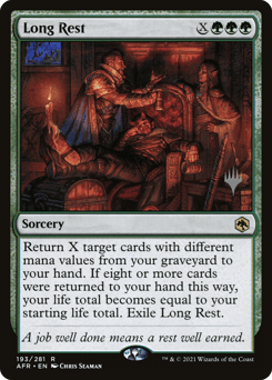 Return X target cards with different mana values from your graveyard to your hand. If eight or more cards were returned to your hand this way, your life total becomes equal to your starting life total. Exile Long Rest.
