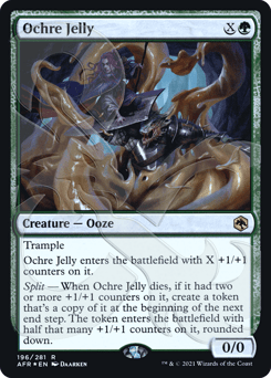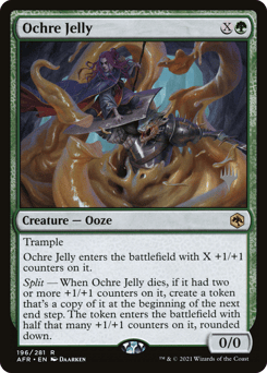 Trample This creature enters with X +1/+1 counters on it. Split — When this creature dies, if it had two or more +1/+1 counters on it, create a token that's a copy of it at the beginning of the next end step. The token enters with half that many +1/+1 counters on it, rounded down.