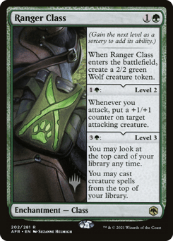 (Gain the next level as a sorcery to add its ability.) When this Class enters, create a 2/2 green Wolf creature token. {1}{G}: Level 2 Whenever you attack, put a +1/+1 counter on target attacking creature. {3}{G}: Level 3 You may look at the top card of your library any time. You may cast creature spells from the top of your library.