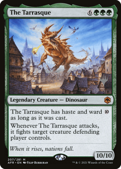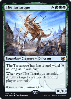 The Tarrasque has haste and ward {10} as long as it was cast. Whenever The Tarrasque attacks, it fights target creature defending player controls.