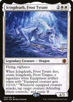 Flying, vigilance When Icingdeath, Frost Tyrant dies, create Icingdeath, Frost Tongue, a legendary white Equipment artifact token with "Equipped creature gets +2/+0," "Whenever equipped creature attacks, tap target creature defending player controls," and equip {2}.