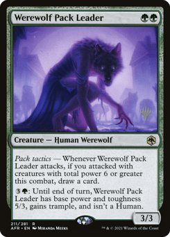 Pack tactics — Whenever this creature attacks, if you attacked with creatures with total power 6 or greater this combat, draw a card. {3}{G}: Until end of turn, this creature has base power and toughness 5/3, gains trample, and isn't a Human.