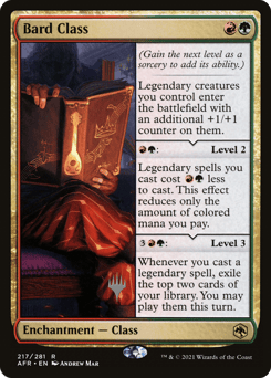 (Gain the next level as a sorcery to add its ability.) Legendary creatures you control enter with an additional +1/+1 counter on them. {R}{G}: Level 2 Legendary spells you cast cost {R}{G} less to cast. This effect reduces only the amount of colored mana you pay. {3}{R}{G}: Level 3 Whenever you cast a legendary spell, exile the top two cards of your library. You may play them this turn.
