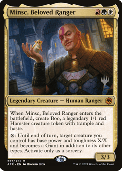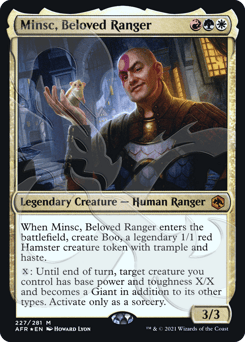 When Minsc enters, create Boo, a legendary 1/1 red Hamster creature token with trample and haste. {X}: Until end of turn, target creature you control has base power and toughness X/X and becomes a Giant in addition to its other types. Activate only as a sorcery.