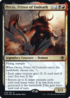 Flying, trample When Orcus enters, choose one — • Each other creature gets -X/-X until end of turn. You lose X life. • Return up to X target creature cards with total mana value X or less from your graveyard to the battlefield. They gain haste until end of turn.