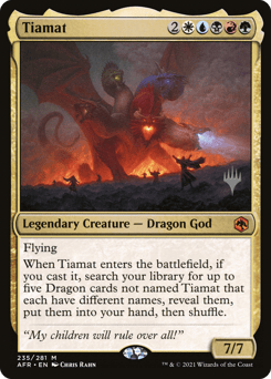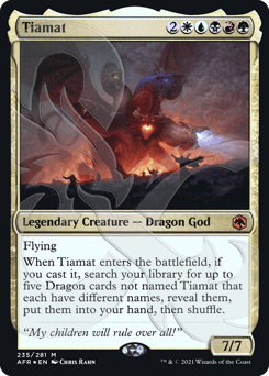 Flying When Tiamat enters, if you cast it, search your library for up to five Dragon cards not named Tiamat that each have different names, reveal them, put them into your hand, then shuffle.