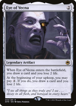 When Eye of Vecna enters, you draw a card and you lose 2 life. At the beginning of your upkeep, you may pay {2}. If you do, you draw a card and you lose 2 life.