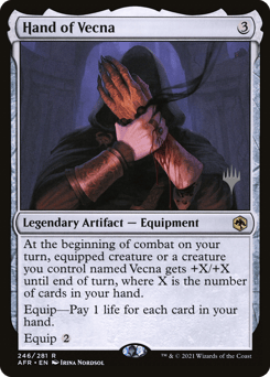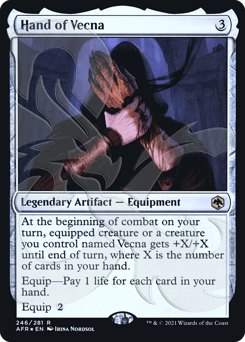 At the beginning of combat on your turn, equipped creature or a creature you control named Vecna gets +X/+X until end of turn, where X is the number of cards in your hand. Equip—Pay 1 life for each card in your hand. Equip {2}
