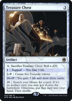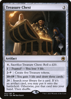 {4}, Sacrifice this artifact: Roll a d20. 1 | Trapped! — You lose 3 life. 2—9 | Create five Treasure tokens. 10—19 | You gain 3 life and draw three cards. 20 | Search your library for a card. If it's an artifact card, you may put it onto the battlefield. Otherwise, put that card into your hand. Then shuffle.