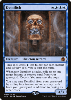 This spell costs {U} less to cast for each instant and sorcery spell you've cast this turn. Whenever this creature attacks, exile up to one target instant or sorcery card from your graveyard. Copy it. You may cast the copy. You may cast this card from your graveyard by exiling four instant and/or sorcery cards from your graveyard in addition to paying its other costs.