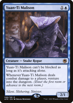 This creature can't be blocked as long as it's attacking alone. Whenever this creature deals combat damage to a player, venture into the dungeon. (Enter the first room or advance to the next room.)