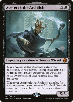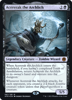 When Acererak enters, if you haven't completed Tomb of Annihilation, return Acererak to its owner's hand and venture into the dungeon. Whenever Acererak attacks, for each opponent, you create a 2/2 black Zombie creature token unless that player sacrifices a creature of their choice.