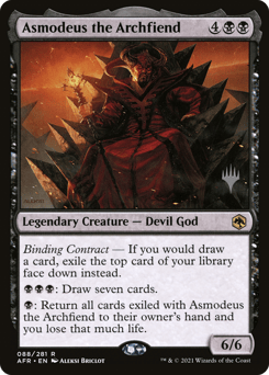Binding Contract — If you would draw a card, exile the top card of your library face down instead. {B}{B}{B}: Draw seven cards. {B}: Return all cards exiled with Asmodeus to their owner's hand and you lose that much life.