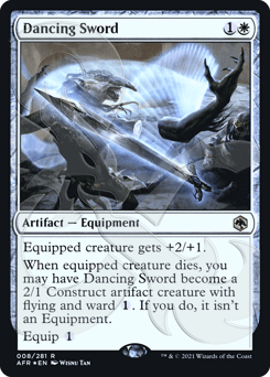 Equipped creature gets +2/+1. When equipped creature dies, you may have this Equipment become a 2/1 Construct artifact creature with flying and ward {1}. If you do, it isn't an Equipment. Equip {1}