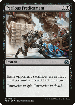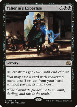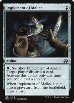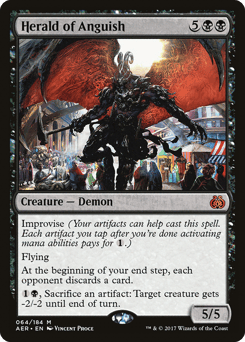 Improvise (Your artifacts can help cast this spell. Each artifact you tap after you're done activating mana abilities pays for {1}.) Flying At the beginning of your end step, each opponent discards a card. {1}{B}, Sacrifice an artifact: Target creature gets -2/-2 until end of turn.