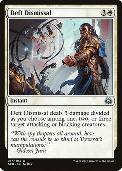 Deft Dismissal deals 3 damage divided as you choose among one, two, or three target attacking or blocking creatures.