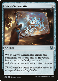 Improvise (Your artifacts can help cast this spell. Each artifact you tap after you're done activating mana abilities pays for {1}.) Whenever a nontoken artifact you control is put into a graveyard from the battlefield, create a 1/1 colorless Servo artifact creature token.