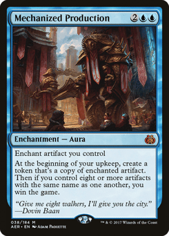 Enchant artifact you control At the beginning of your upkeep, create a token that's a copy of enchanted artifact. Then if you control eight or more artifacts with the same name as one another, you win the game.